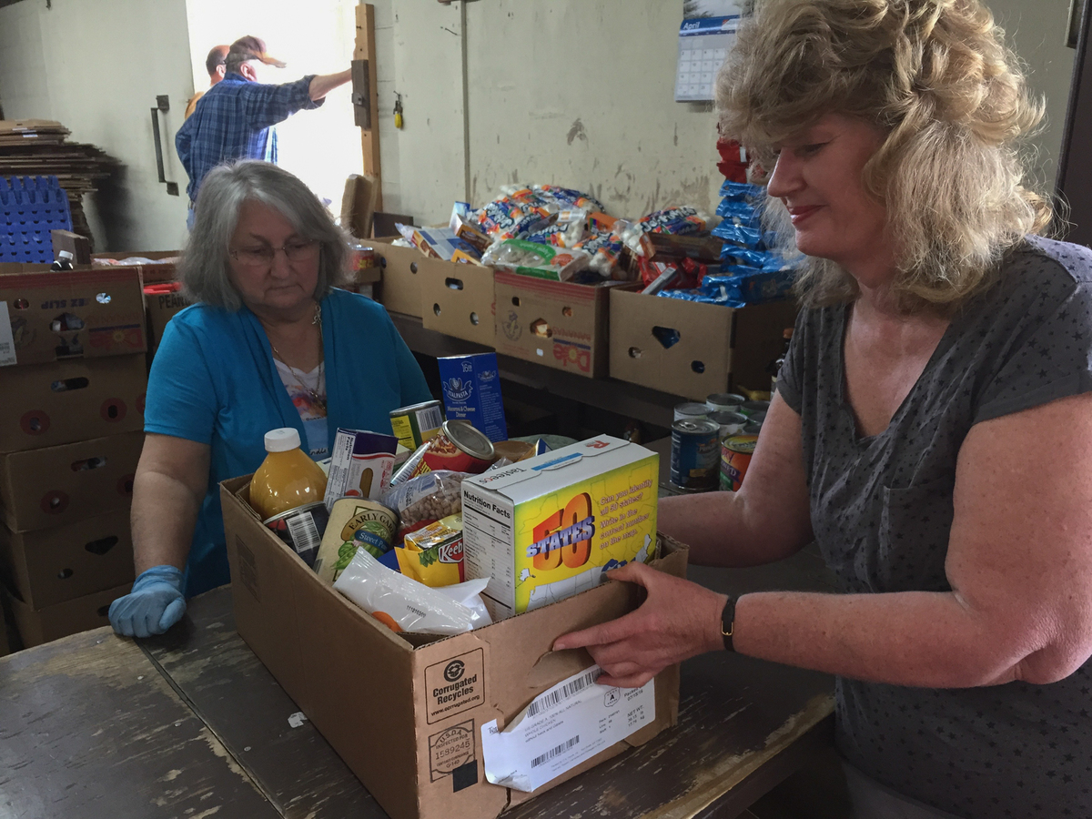 Cathy Rose is getting a box of free food from Volunteer Rilda White at the pantry in Clintwood, Va. Rose says she relies on the free food because she lives on Social Security disability and the monthly check doesn't cover her bills.